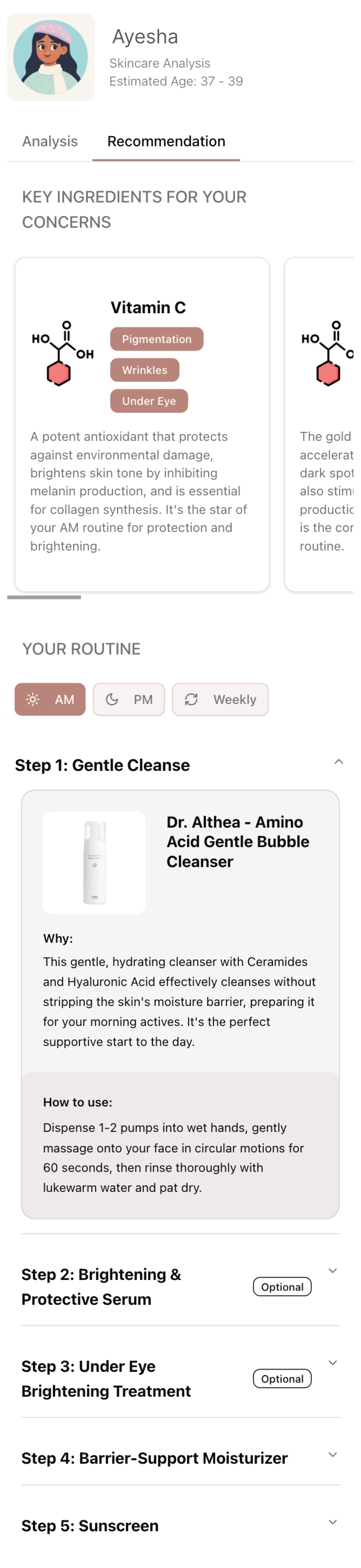 Our AI breaks down why a specific ingredient works for your skin. Whether it’s Retinol or Peptides, every recommendation is grounded in skin science.